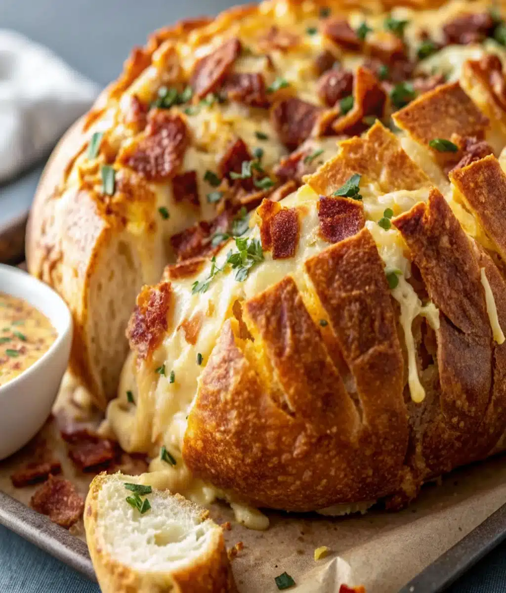Cheese Bacon Cob Loaf Dip is a rich and creamy dip served in a hollowed round cob loaf, filled with a delicious mixture of cheeses, crispy bacon, and herbs, perfect for gatherings and entertaining.