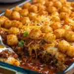 Chili Cheese Tater Tot Casserole is a warm, hearty dish perfect for family dinners, combining savory chili, gooey cheese, and crispy tater tots.