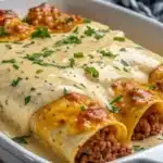 You are in for such a treat with this recipe! These Decadent Breakfast Enchiladas with Sausage Gravy offer a truly unique spin on your morning meal. First, it combines all your favorite breakfast elements into one glorious, comforting casserole.