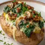 If you’re preparing these baked potatoes with spinach and mushrooms ahead of time, bake the potatoes and prepare the filling separately. Store them in the refrigerator, then combine and bake just before serving for the freshest taste and texture. A final optional tip: a touch of nutmeg in the filling can elevate the cheesy, creamy flavors beautifully. These tips will help you create the most incredible Easy Cheesy Stuffed Baked Potatoes with Spinach and Mushrooms every single time!