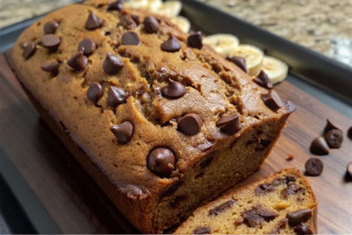 Peanut Butter Chocolate Chip Banana Bread loaf with chocolate chips