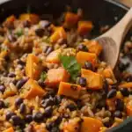 - Garnish & Enjoy: Finally, fluff the black bean and rice skillet with a fork. Garnish generously with fresh chopped cilantro and serve with lime wedges. Dig into your delicious homemade Southwest sweet potato rice skillet!