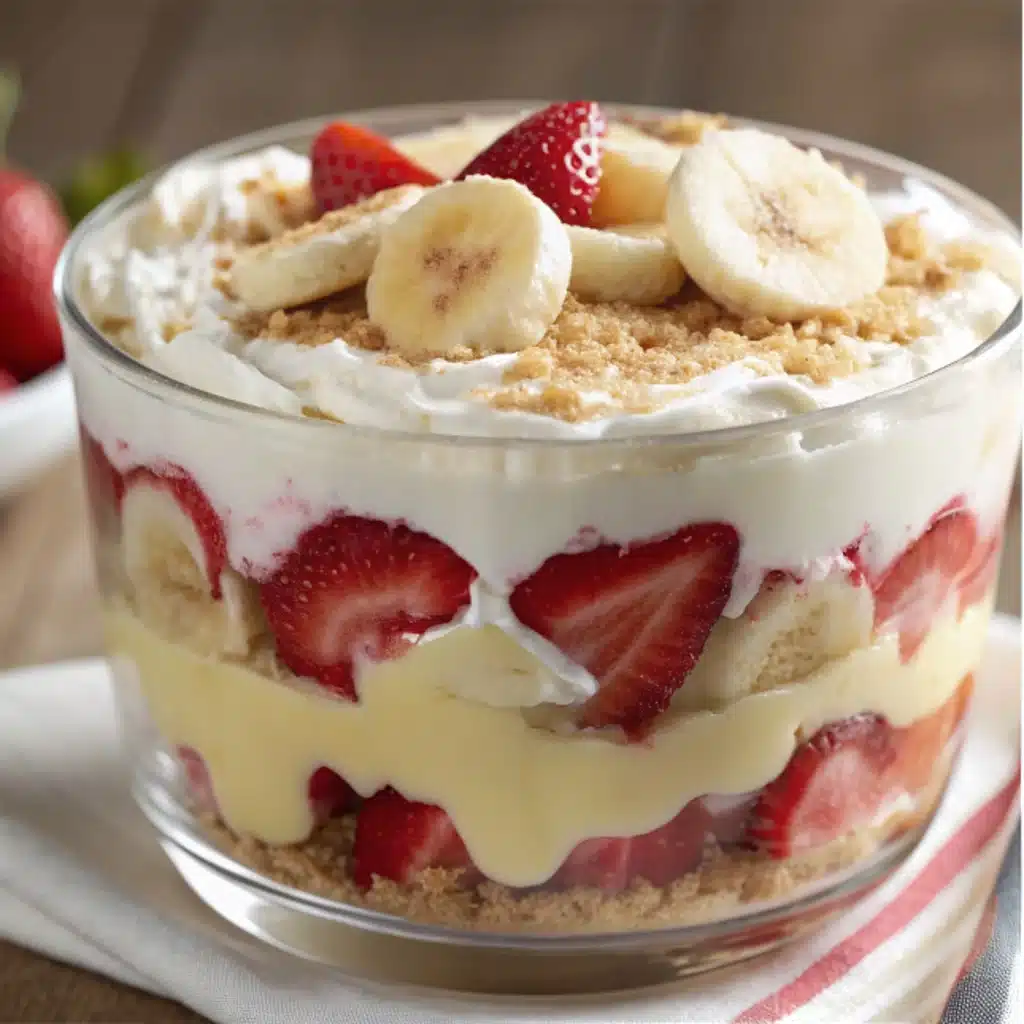 Strawberry Banana Pudding Dream is a delicious no-bake dessert that combines layers of creamy pudding, fresh strawberries, and bananas for a delightful treat.